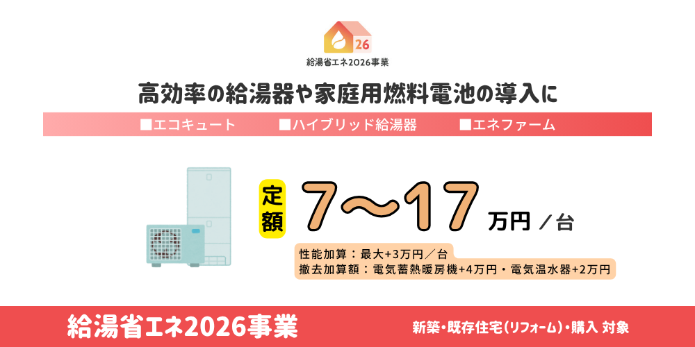 給湯省エネ2026事業 | 経済産業省 | 新築・リフォーム | 最大17万円/台+加算額 |