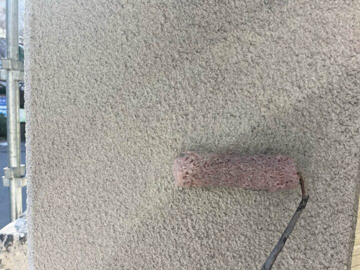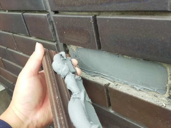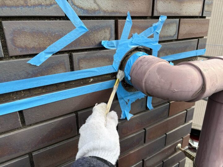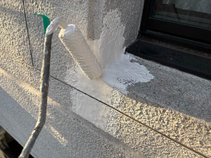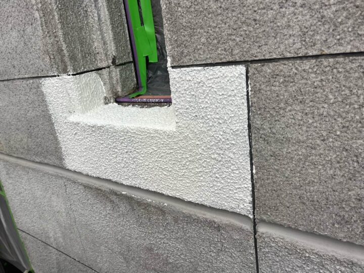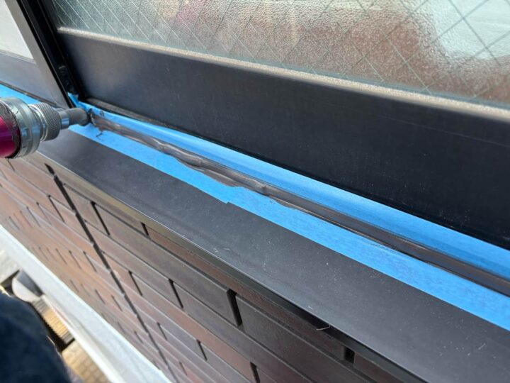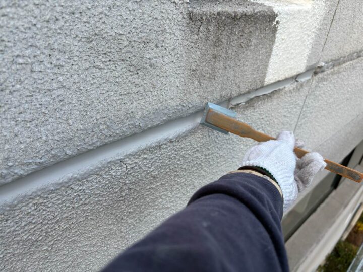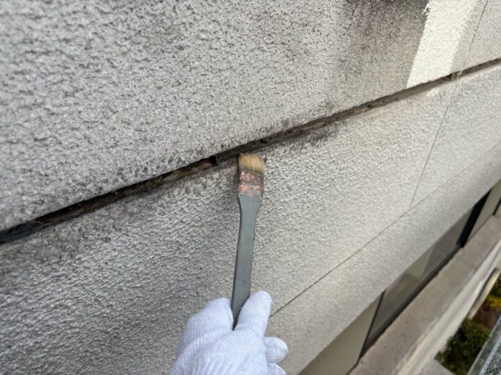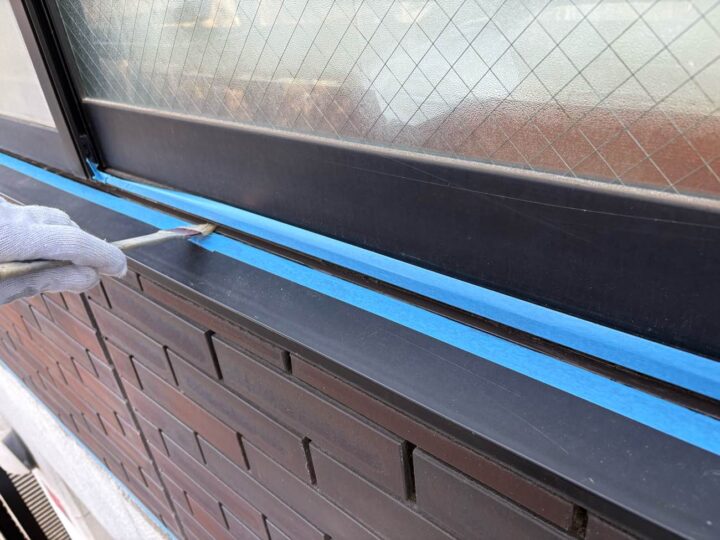 シーリング材打設の前に専用プライマーを塗布し、外壁材とシーリング材の付着性をよくします。 又、3面接着を回避するため2面にのみ塗布しています。 -