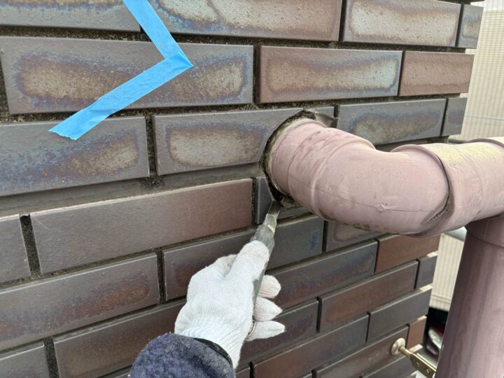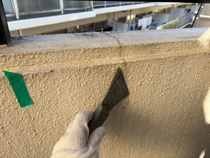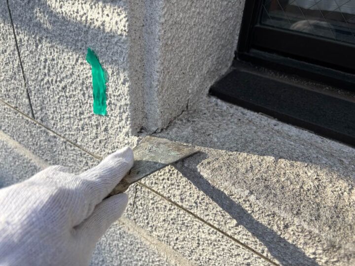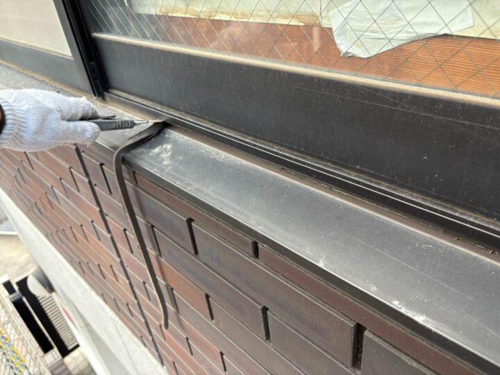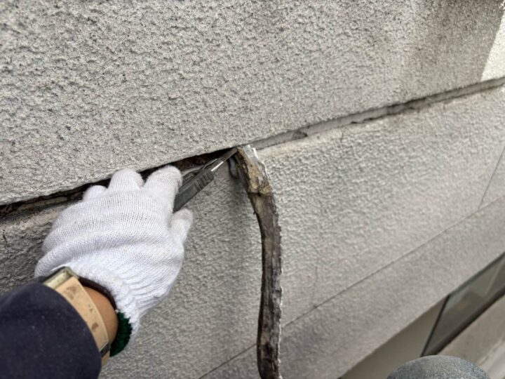 カッターなど専用工具を使用し既存のシーリング材を撤去しています。 -