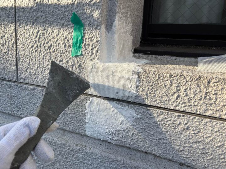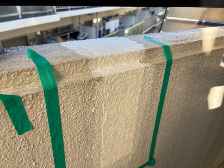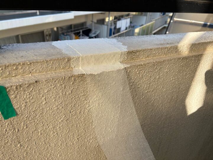 補修材を塗布し、補強メッシュをはりつけます。 -