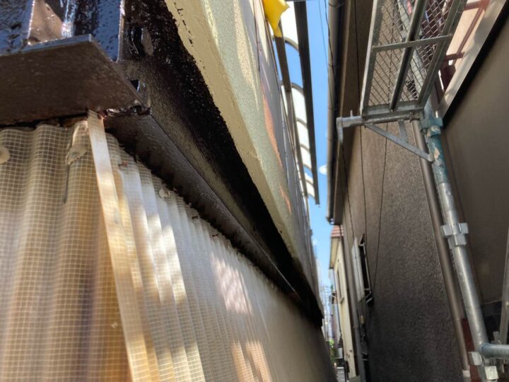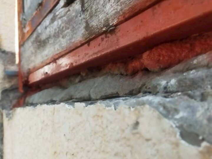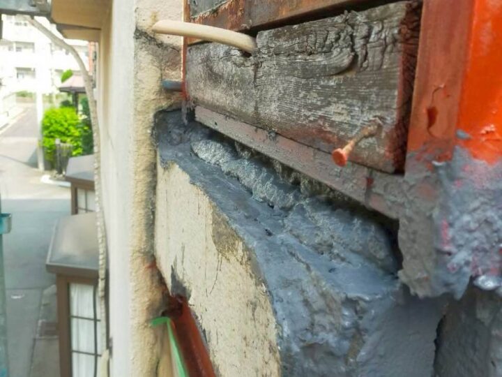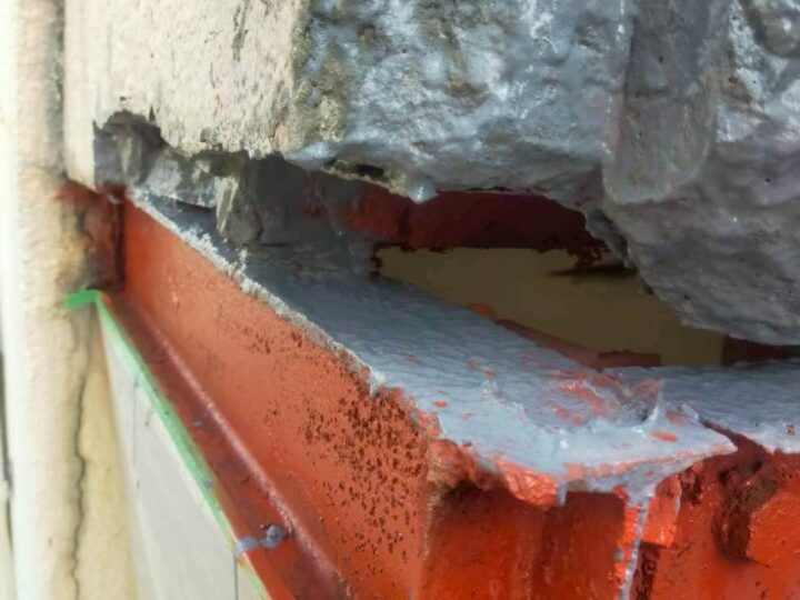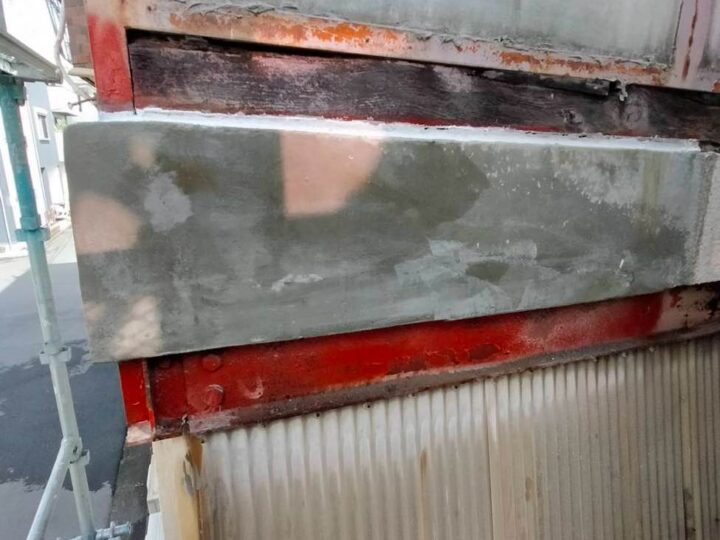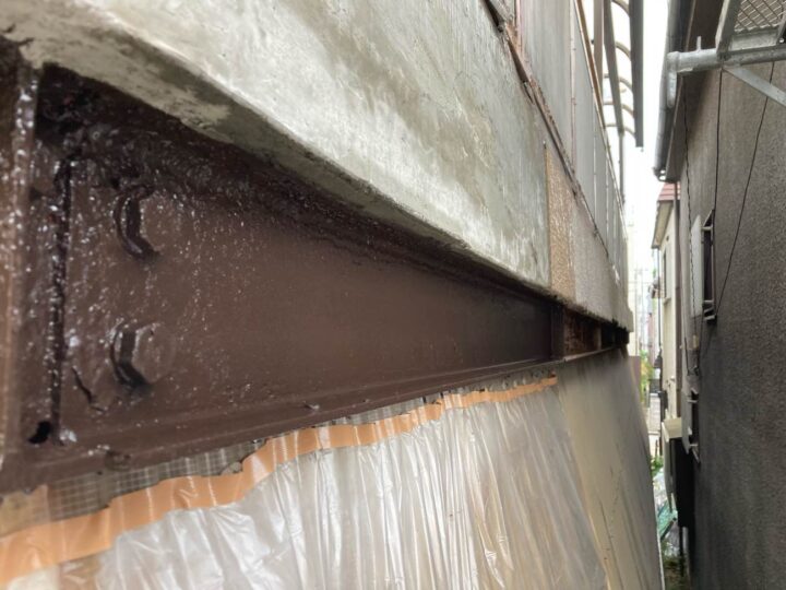 劣化した既存部分を斫り、鉄部に錆止め塗料を塗布します。 -