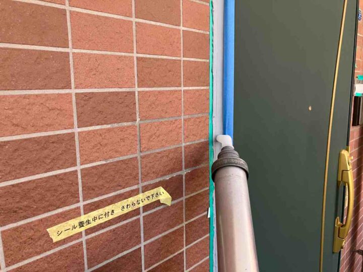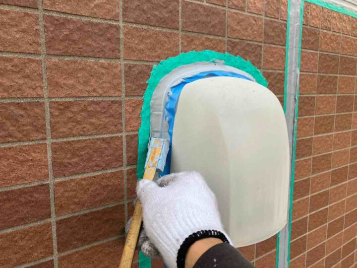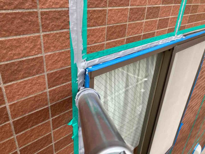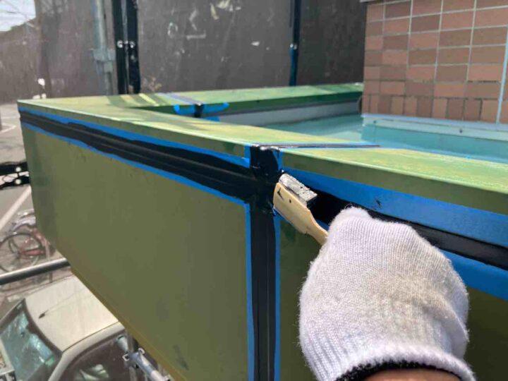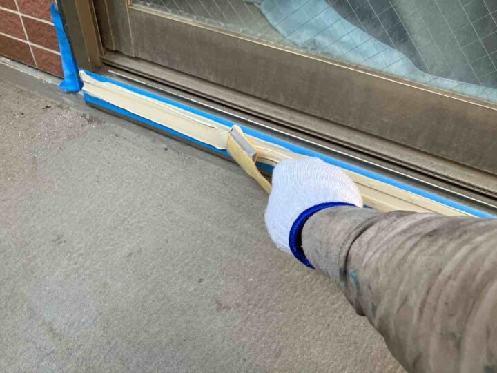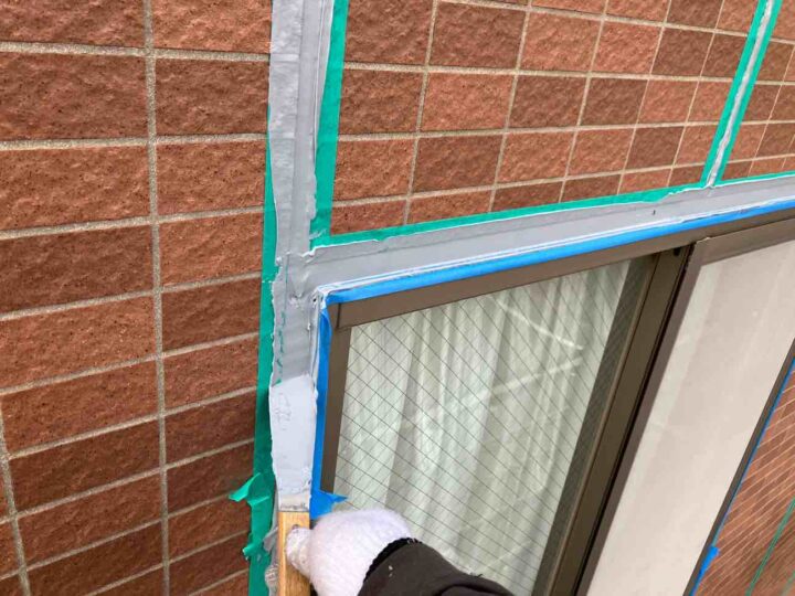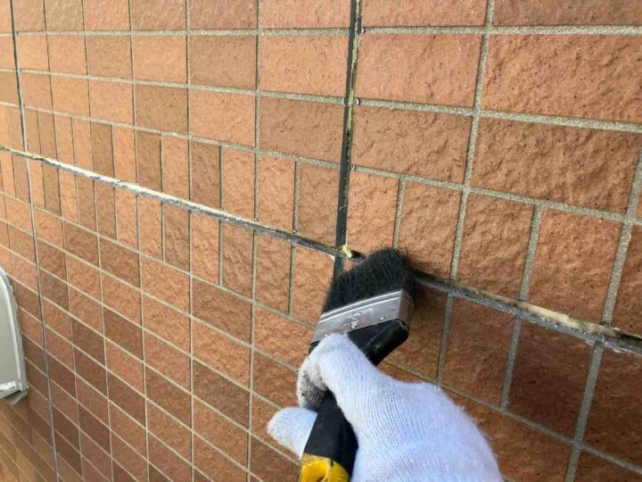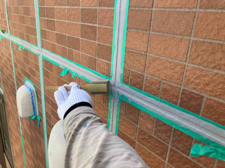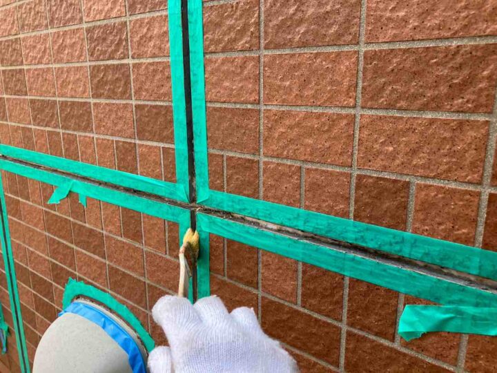シーリング材打設の前に専用プライマーを塗布し、外壁材とシーリング材の付着性をよくします。 又、3面接着を回避するため2面にのみ塗布しています。 -