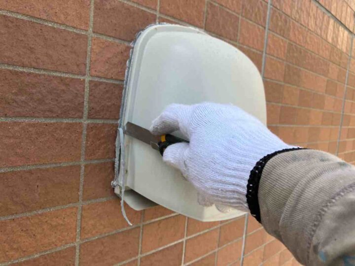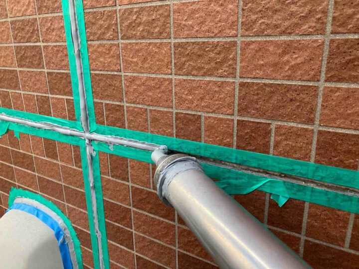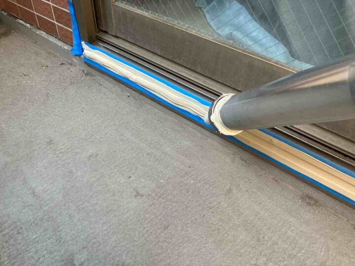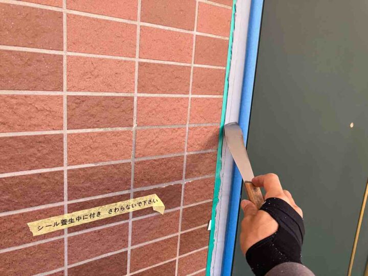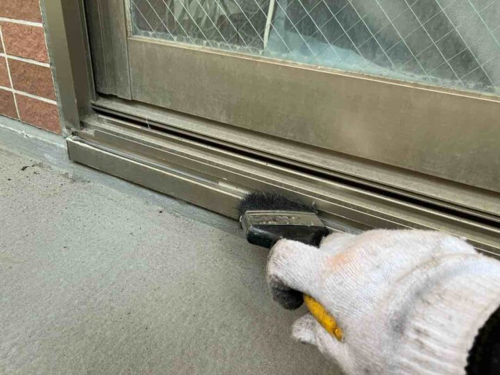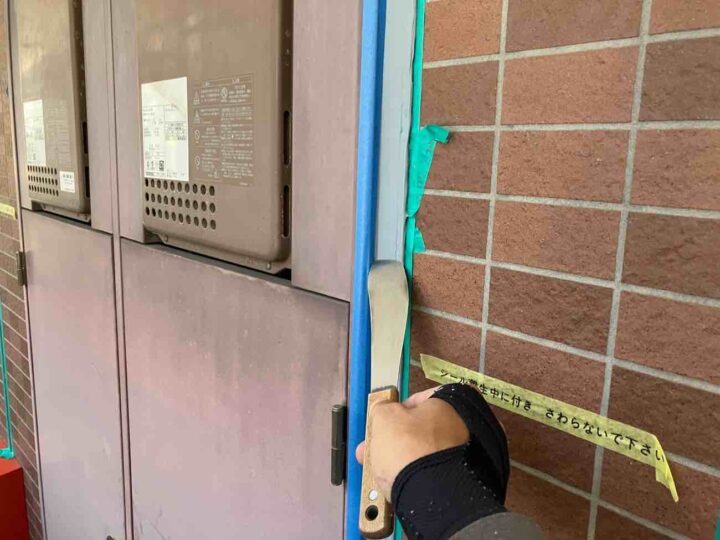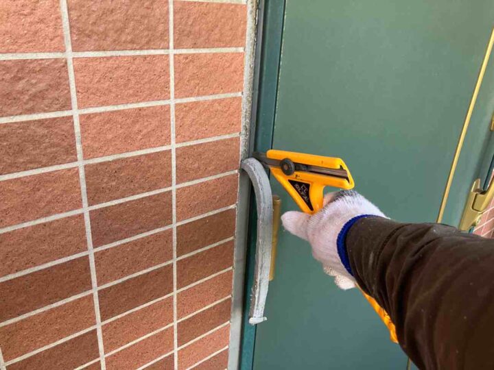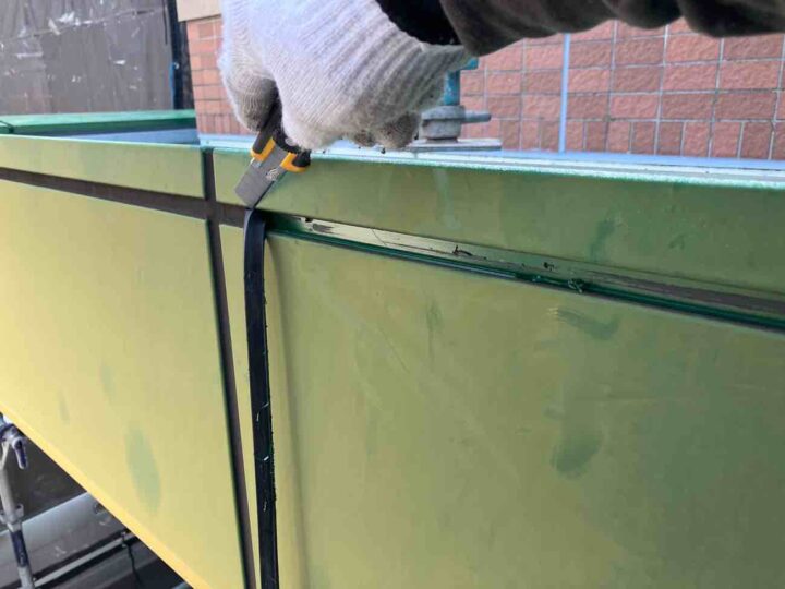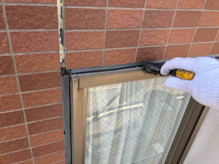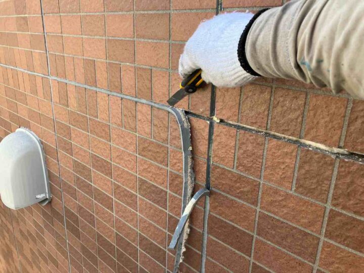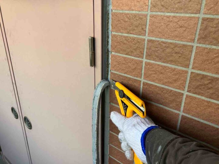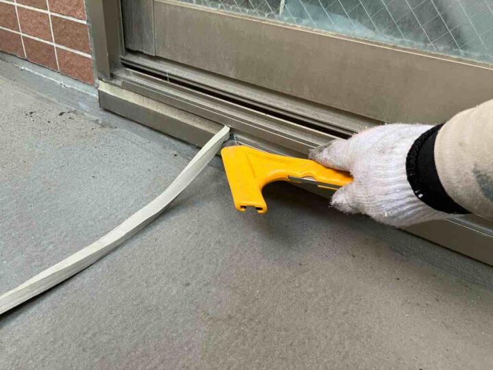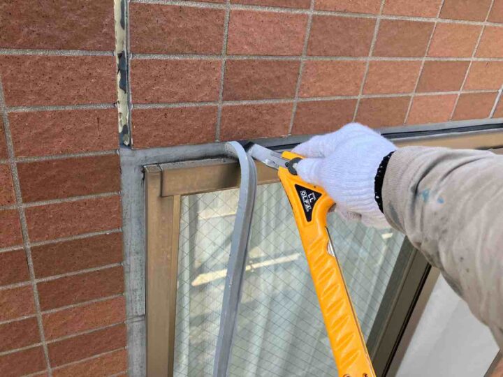 カッターなど専用工具を使用し既存のシーリング材を撤去しています。 -