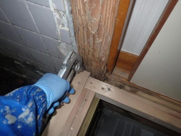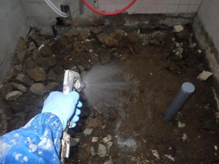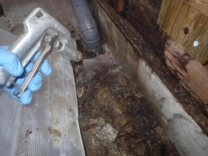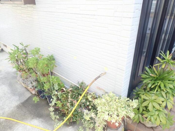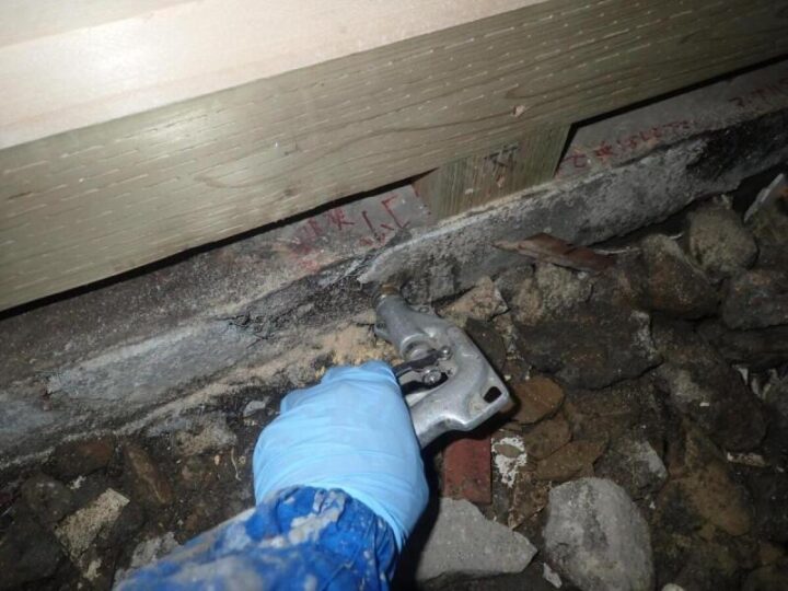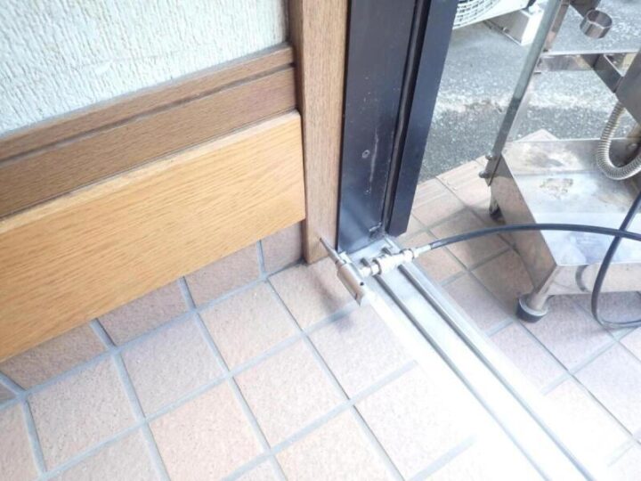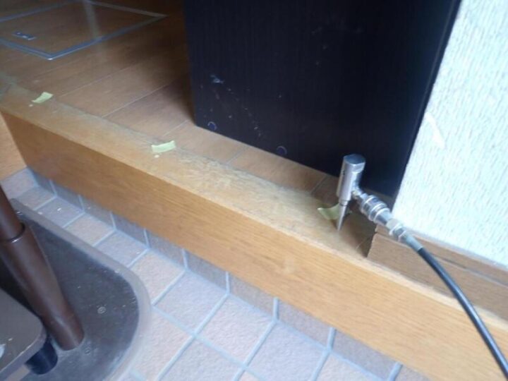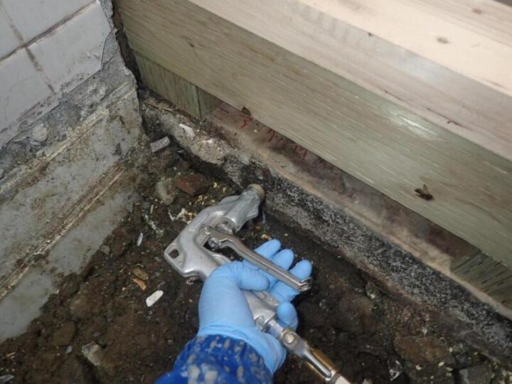 床下から薬剤処理することができない場合、壁から薬剤を注入します。注入後はセメント・シリコン等にて穴を修復します。 -