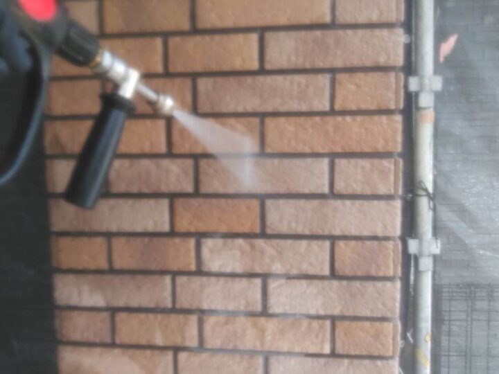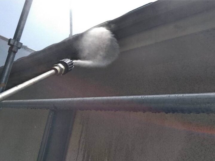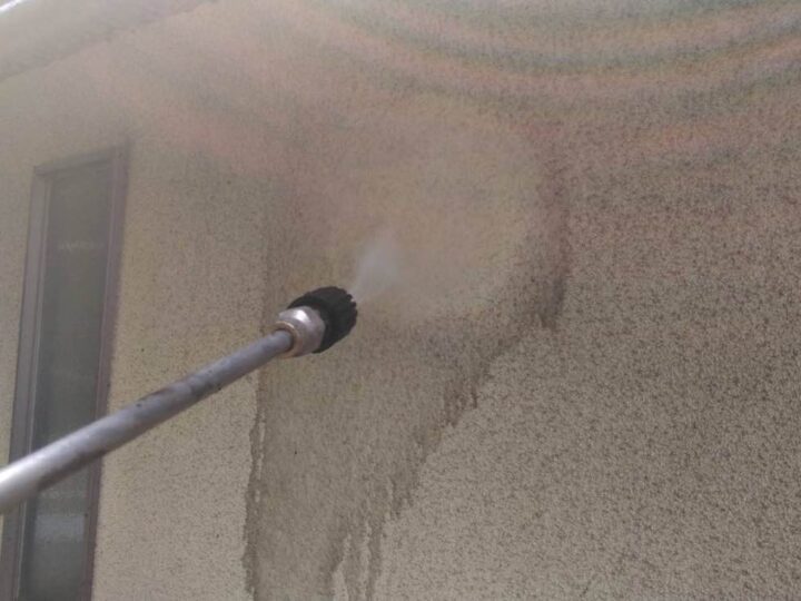 塗料の密着性を高める為、外壁に付いた長年の汚れやホコリなどを業務用の高圧洗浄機にて洗浄いたします。 -
