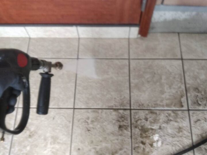 高圧洗浄の際、塗装する屋根や外壁だけではなく、駐車場床の土間なども高圧洗浄いたします。 -