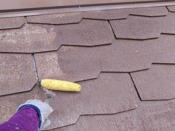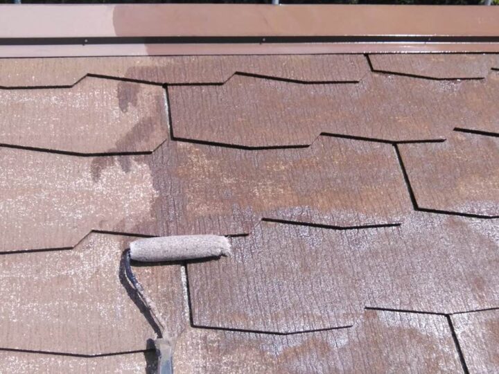 屋根は経年劣化により、屋根材がボソボソになってしまっており、1回の下塗りは吸い込まれてしまいます。 上塗り塗料の耐久性を保つために、下塗りを2回塗布し、しっかりと塗膜を形成させます。 -