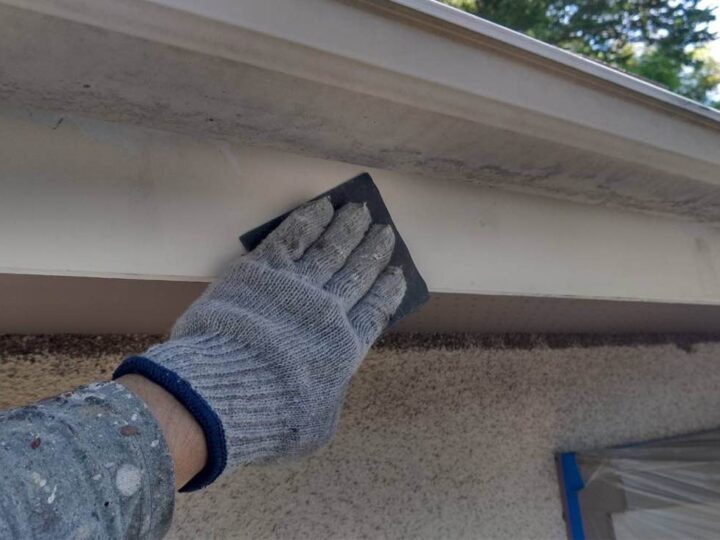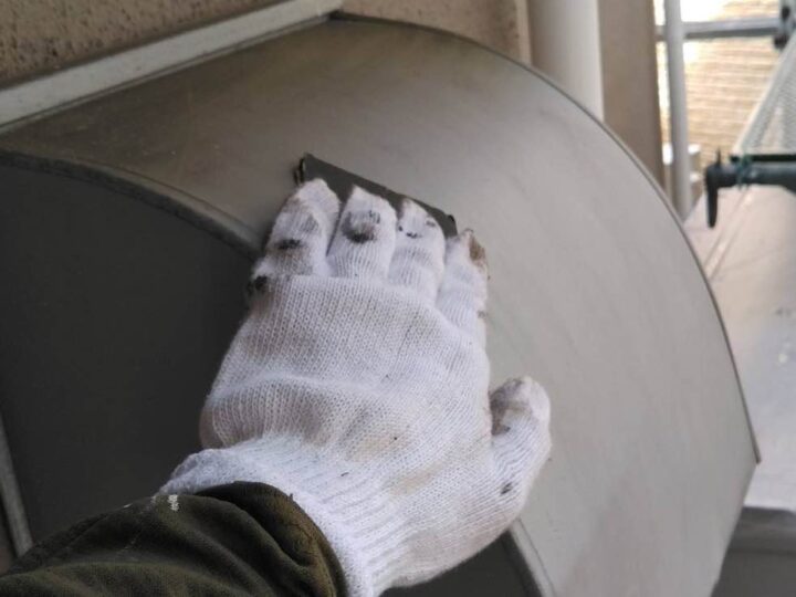 スチール製の付帯部は、塗料の密着性を高める為、ケレンという軽くキズを付ける作業が重要です -