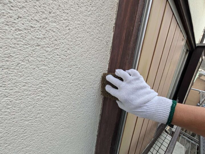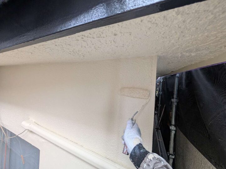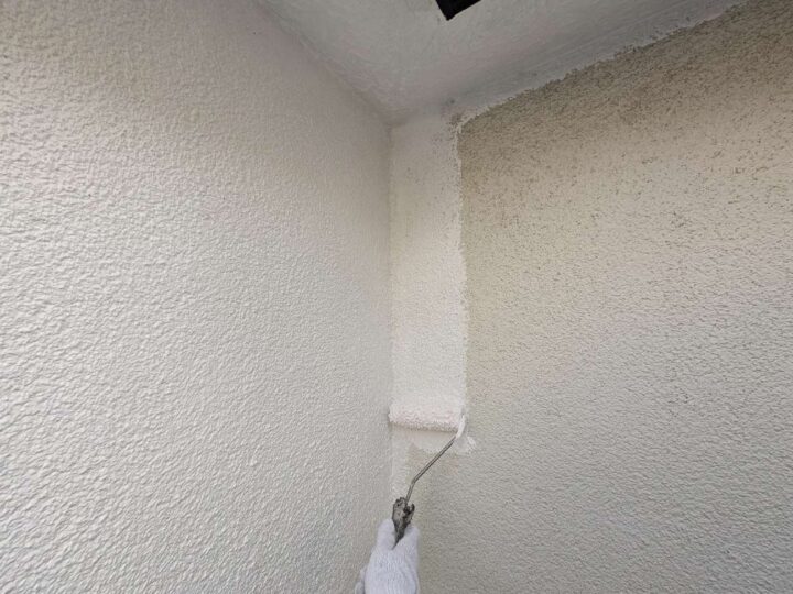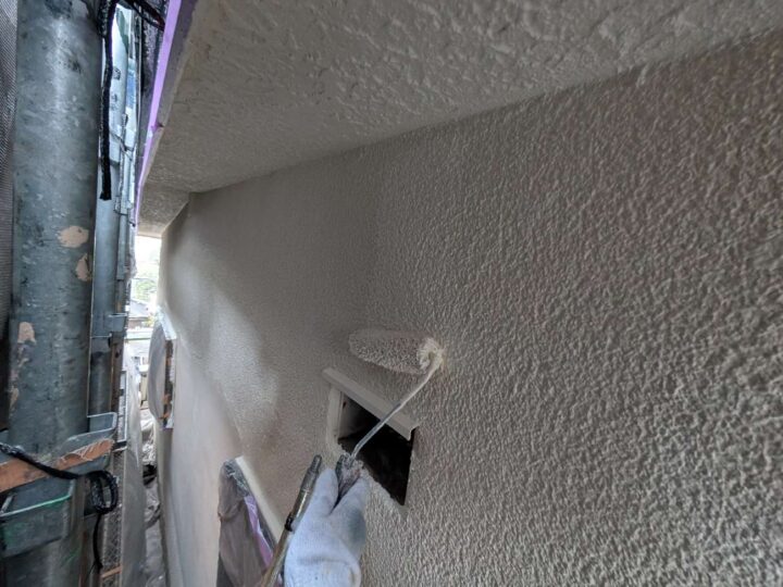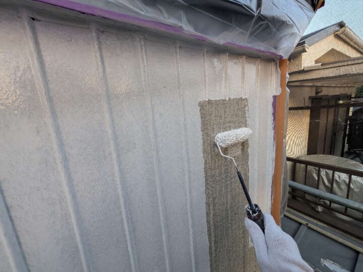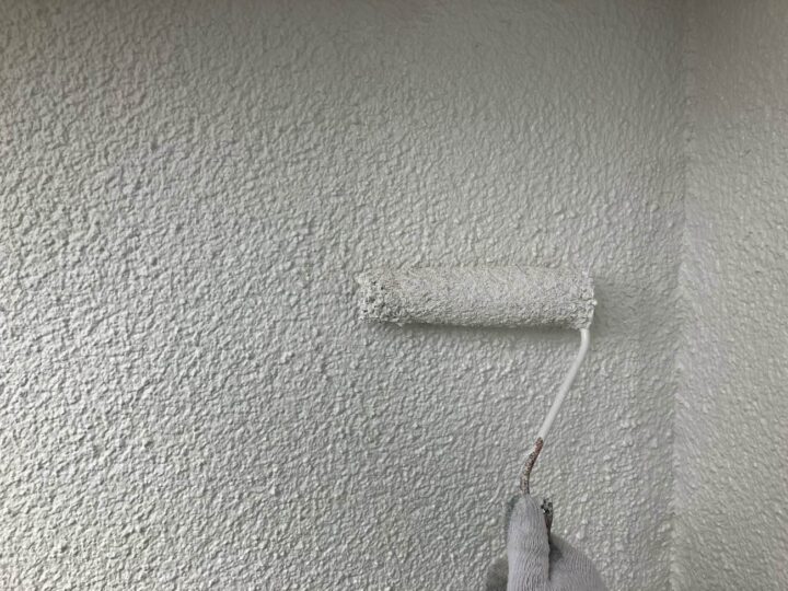 「微弾性フィラー」と呼ばれる、弾力性があり細かなひび割れなどを埋めてくれる下塗り材を塗布いたします。 -
