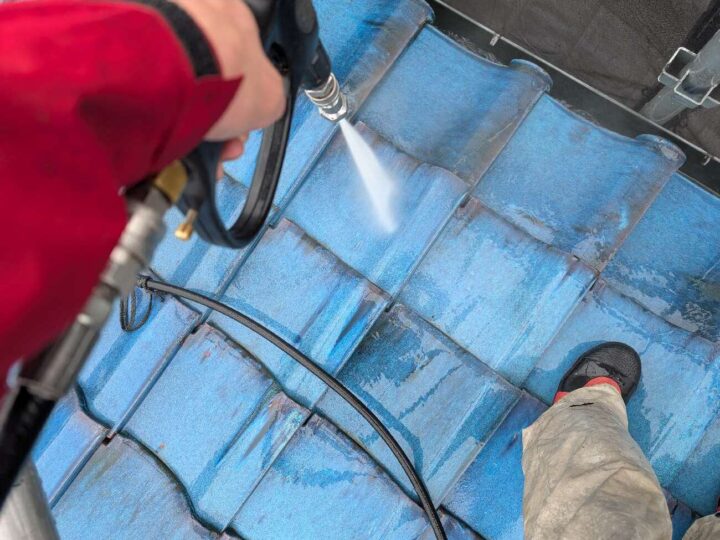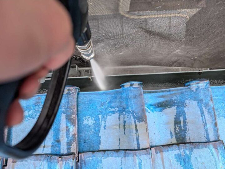 業務用の高圧洗浄機を使い、屋根を洗浄していきます。 外壁や屋根に付いた汚れなどを水圧で洗い流し、塗料の密着性を良くします。 -