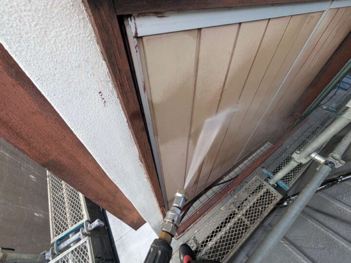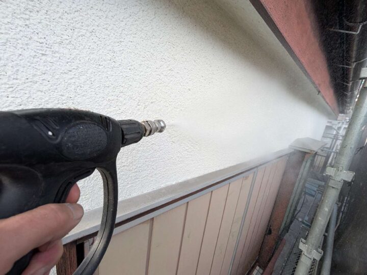 塗料の密着性を高める為、外壁に付いた長年の汚れやホコリなどを業務用の高圧洗浄機にて洗浄いたします。 -