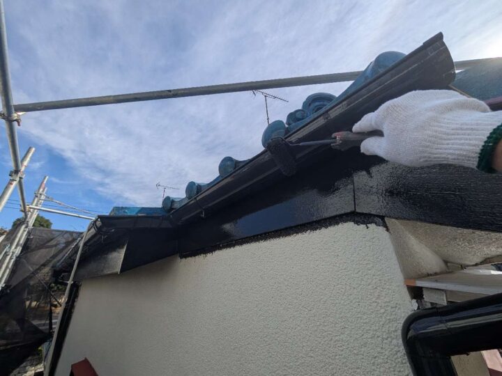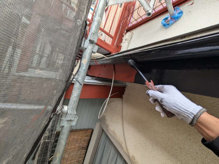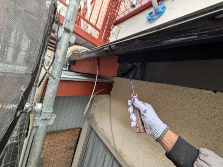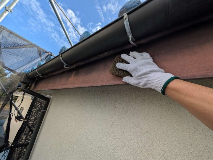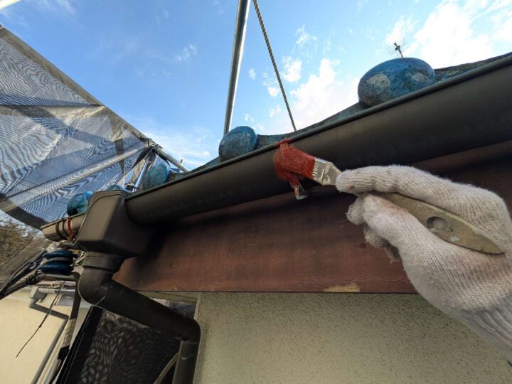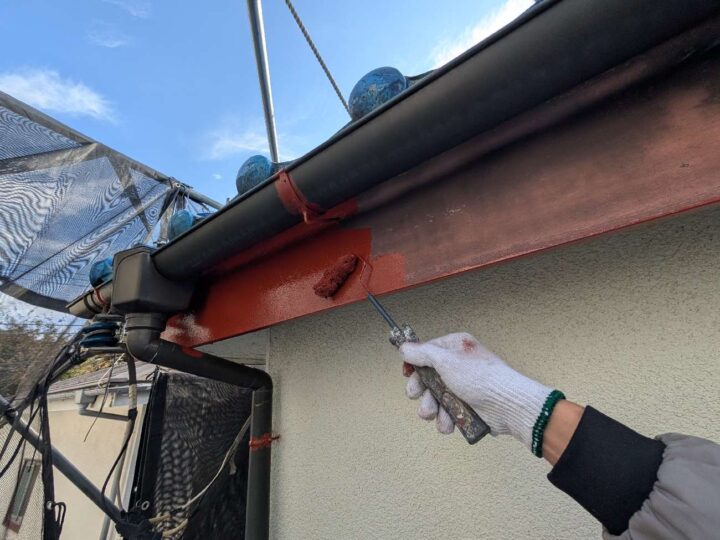 ケレン後に、雨樋の留め具に、鉄部用のサビ止め塗料を塗布いたします。 -