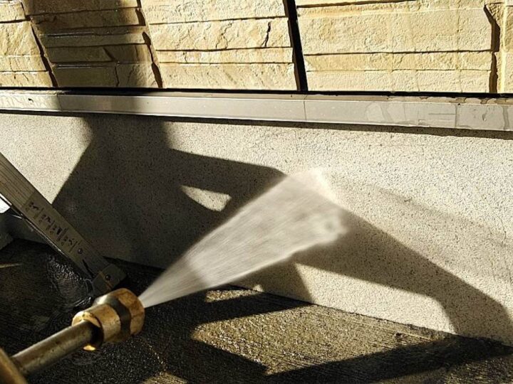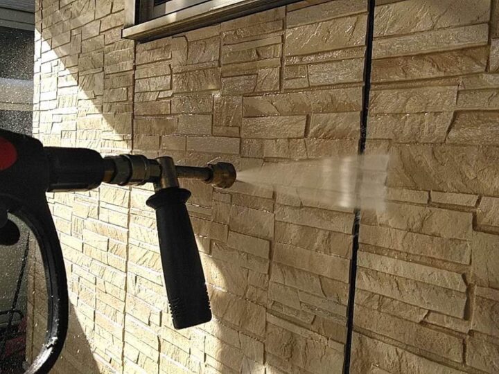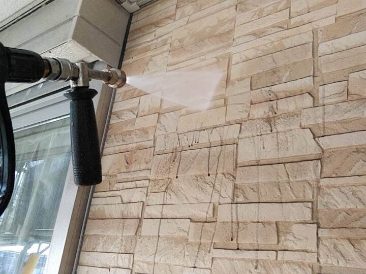 塗料の密着性を高める為、外壁に付いた長年の汚れやホコリなどを業務用の高圧洗浄機にて洗浄いたします。 -