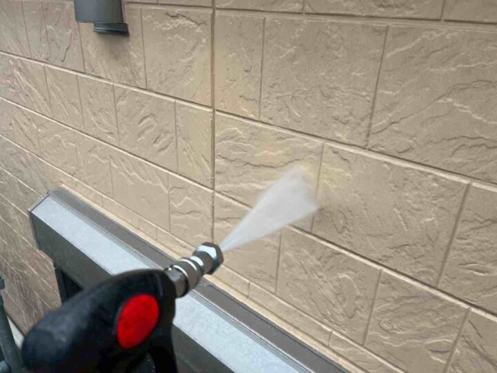 塗料の密着性を高める為、外壁に付いた長年の汚れやホコリなどを業務用の高圧洗浄機にて洗浄いたします。 -
