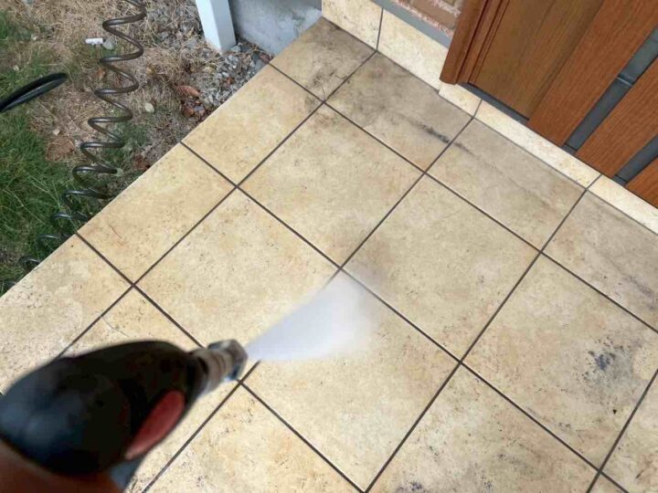高圧洗浄の際、塗装する屋根や外壁だけではなく、駐車場床の土間なども高圧洗浄いたします。 -