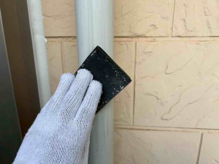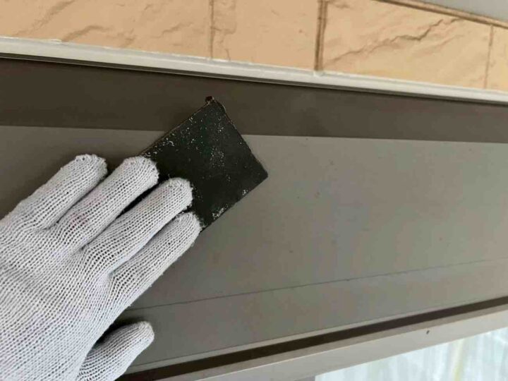スチール製の付帯部は、塗料の密着性を高める為、ケレンという軽くキズを付ける作業が重要です。 -