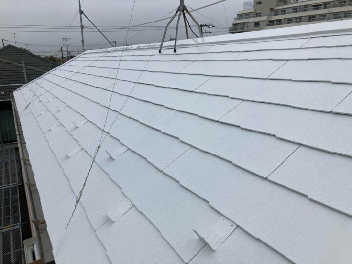 屋根の上塗り2回目の行っております。 上塗り塗料を2回塗ることにより、塗料の耐久性を発揮します。 -