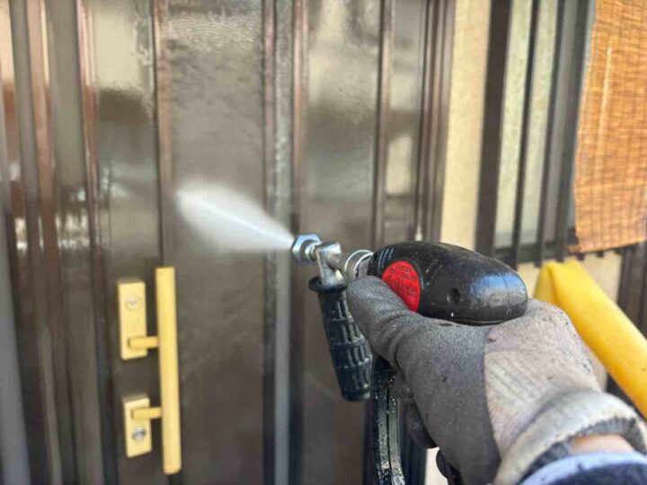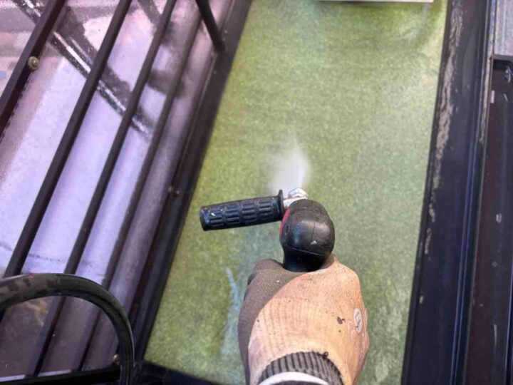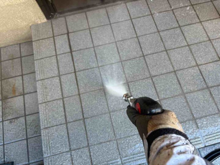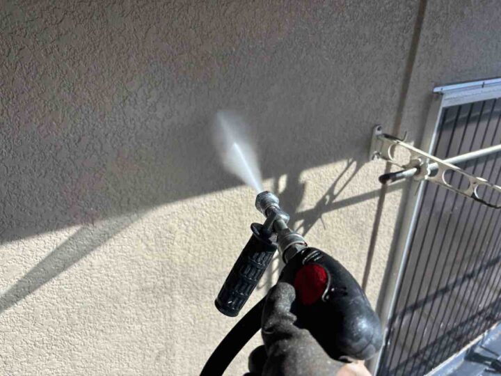 塗料の密着性を高める為、外壁に付いた長年の汚れやホコリなどを業務用の高圧洗浄機にて洗浄いたします。 -