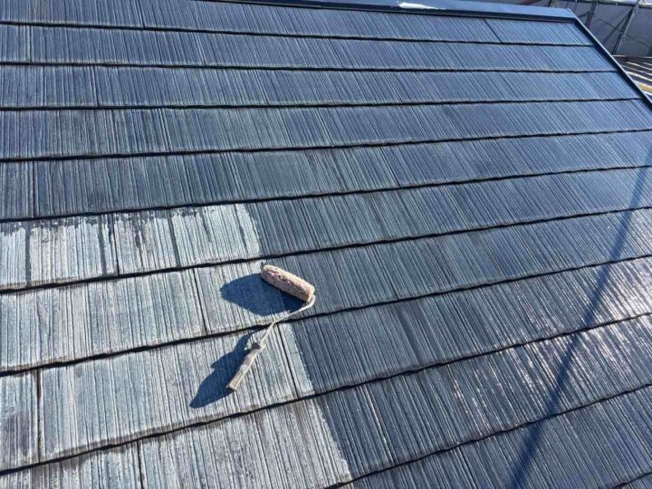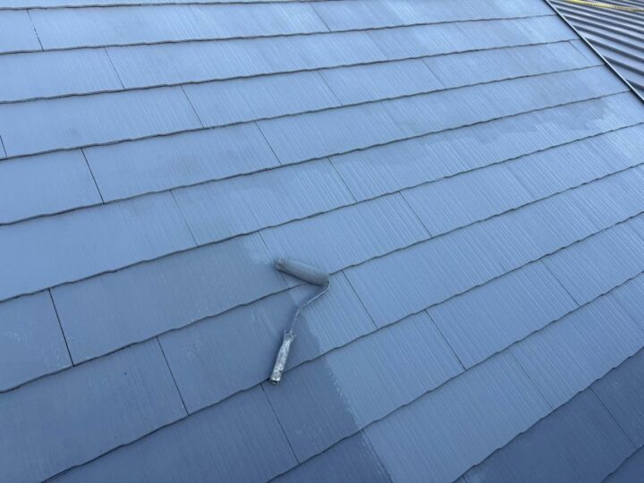 屋根の上塗り2回目の行っております。 上塗り塗料を2回塗ることにより、塗料の耐久性を発揮します。 -