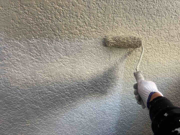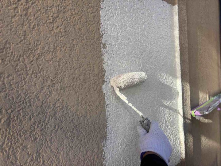 「微弾性フィラー」と呼ばれる、弾力性があり細かなひび割れなどを埋めてくれる下塗り材を塗布いたします。 -