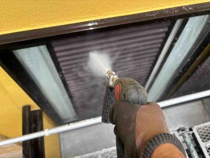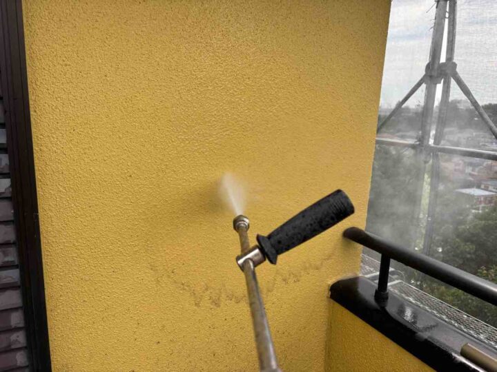 塗料の密着性を高める為、外壁に付いた長年の汚れやホコリなどを業務用の高圧洗浄機にて洗浄いたします。 -