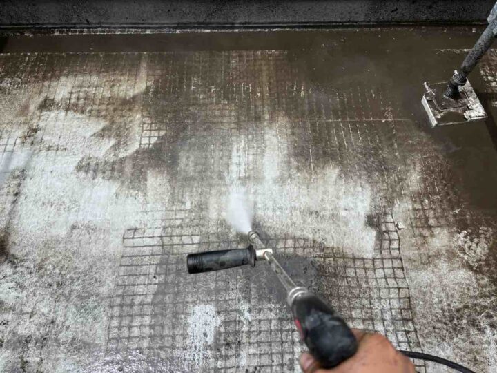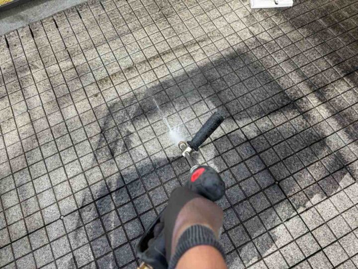 高圧洗浄の際、塗装する屋根や外壁だけではなく、駐車場床の土間なども高圧洗浄いたします。 -