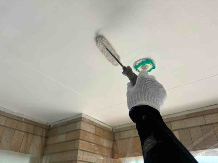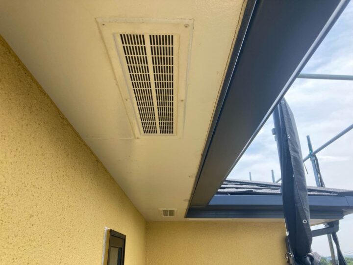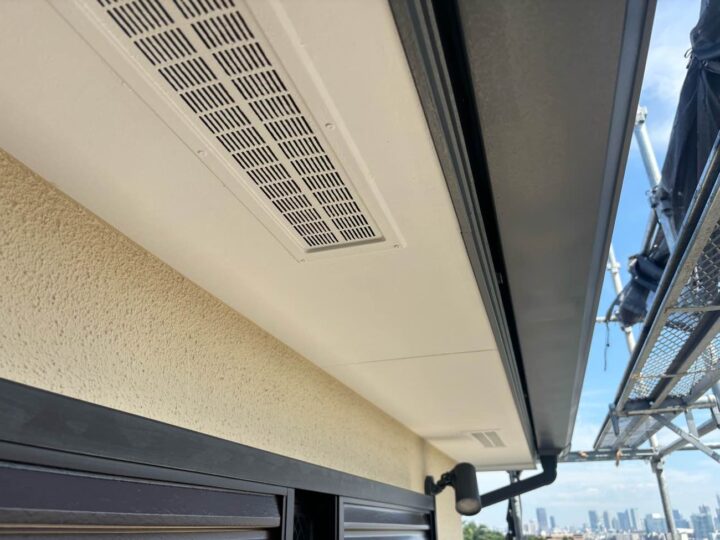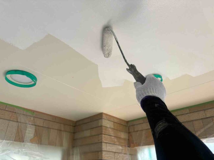 透湿性・防カビ性に優れた軒天井専用塗料にて、上塗り2回目を塗布しております。 -