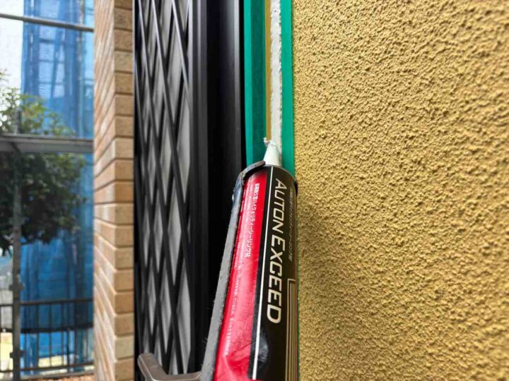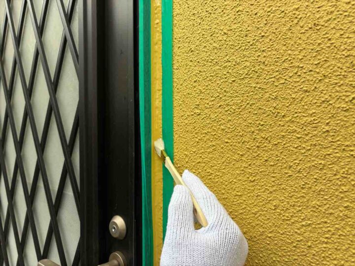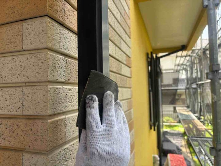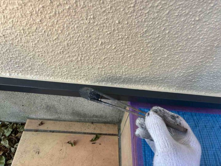 シーリング材打設の前に専用プライマーを塗布し、外壁材とシーリング材の付着性をよくします。 又、3面接着を回避するため2面にのみ塗布しています。 -