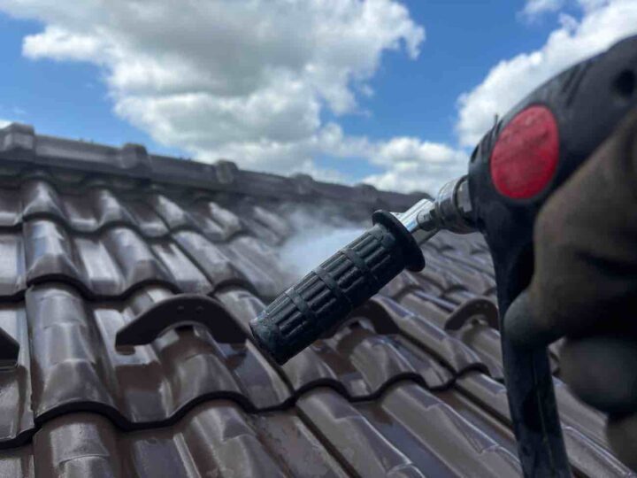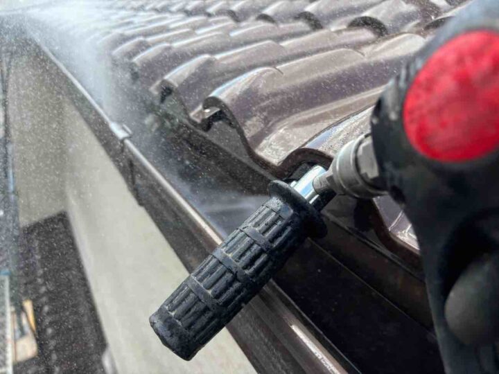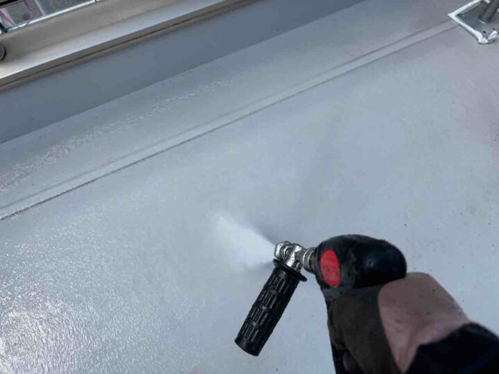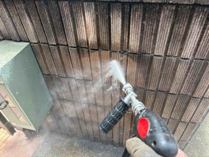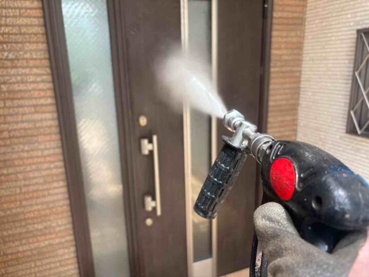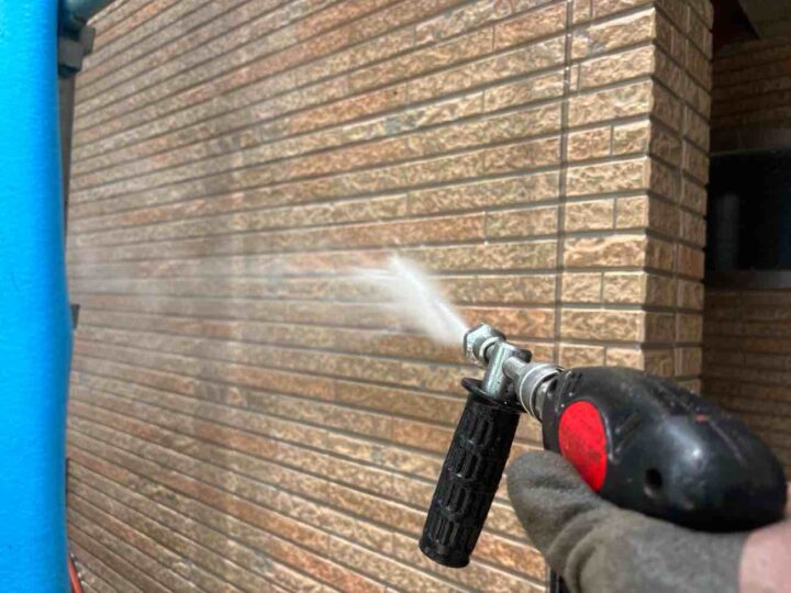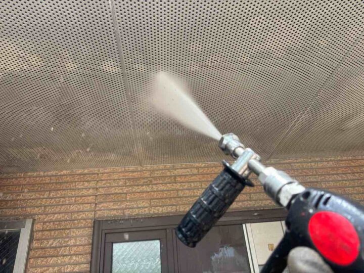 塗料の密着性を高める為、外壁に付いた長年の汚れやホコリなどを業務用の高圧洗浄機にて洗浄いたします。 -