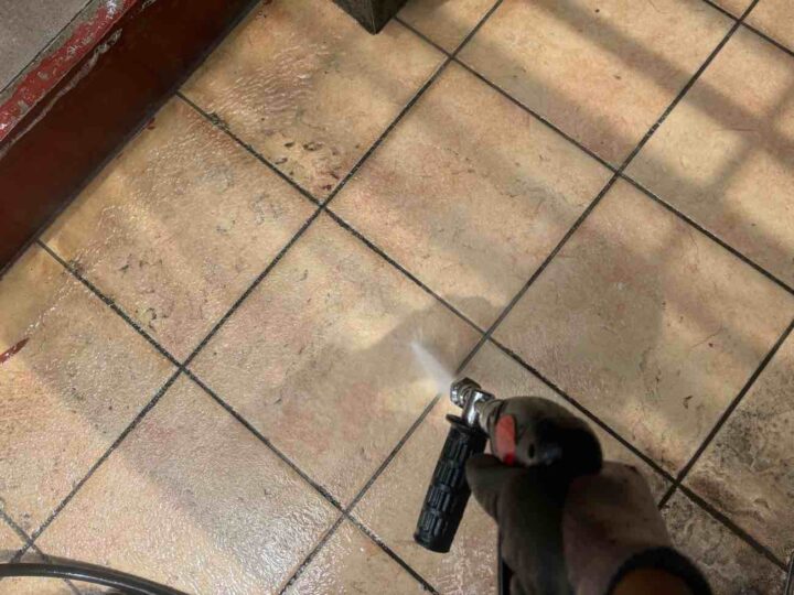 高圧洗浄の際、塗装する屋根や外壁だけではなく、駐車場床の土間なども高圧洗浄いたします。 -
