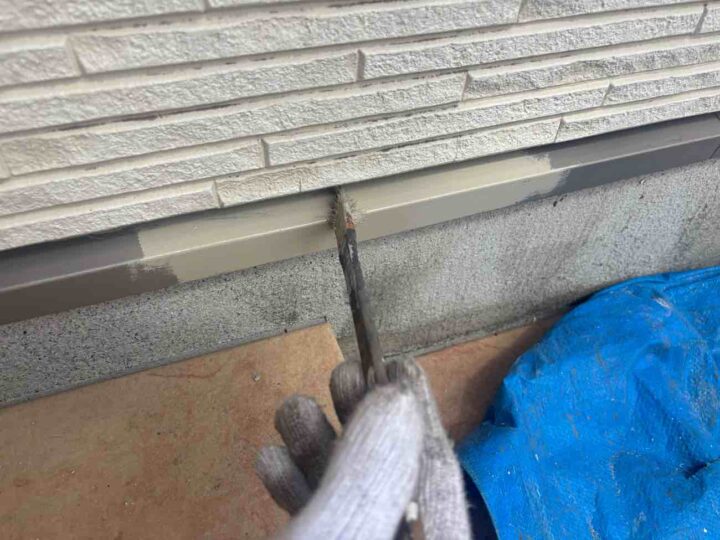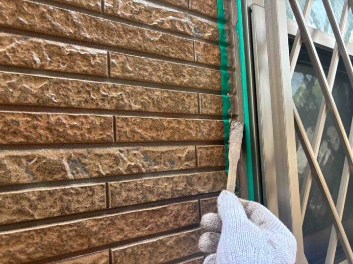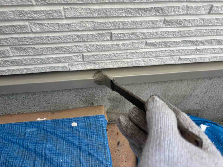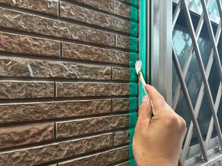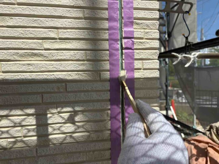 シーリング材打設の前に専用プライマーを塗布し、外壁材とシーリング材の付着性をよくします。 又、3面接着を回避するため2面にのみ塗布しています。 -