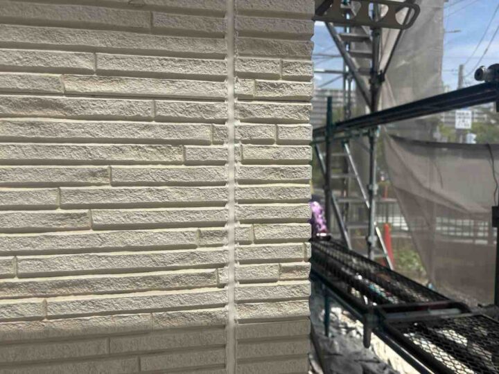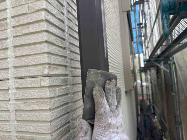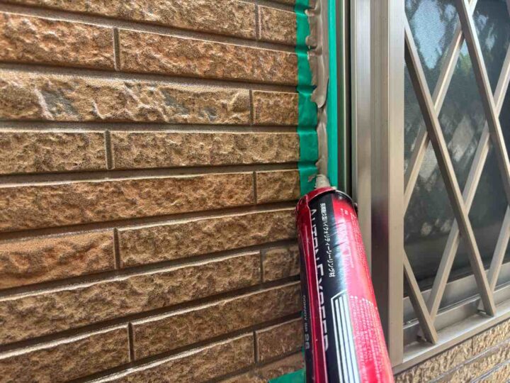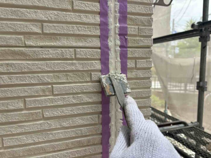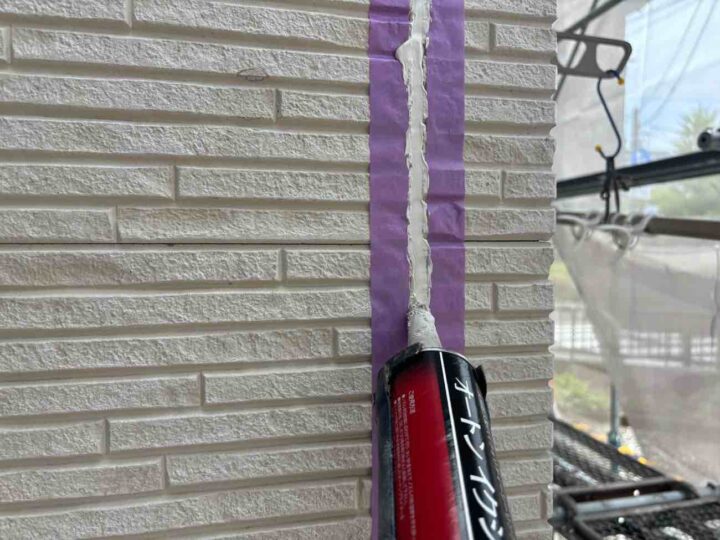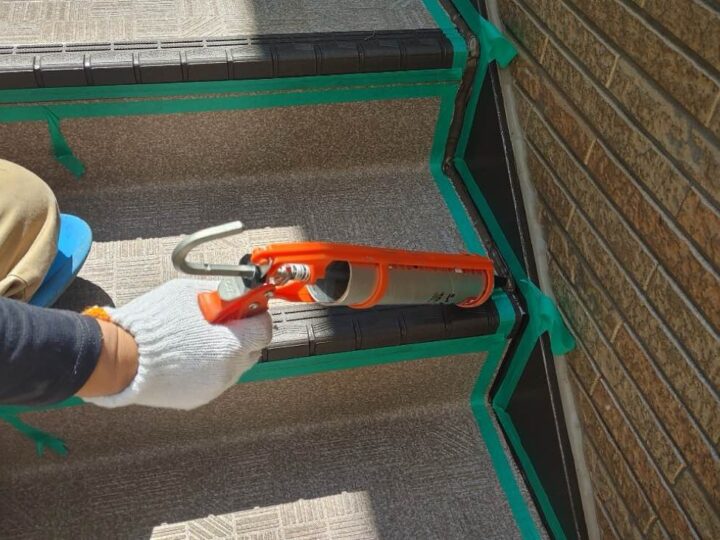 工程の一番最後に、防水目的の為のシーリング工事をしていきます。養生をし、端末シールを充填します。 -