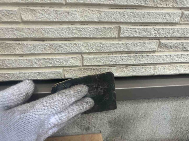 カッターなど専用工具を使用し既存のシーリング材を撤去しています。 -