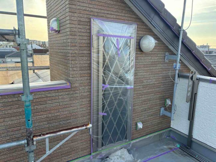 窓やアルミサッシなど、塗装しない箇所に塗料が付着しないよう、養生していきます。 -