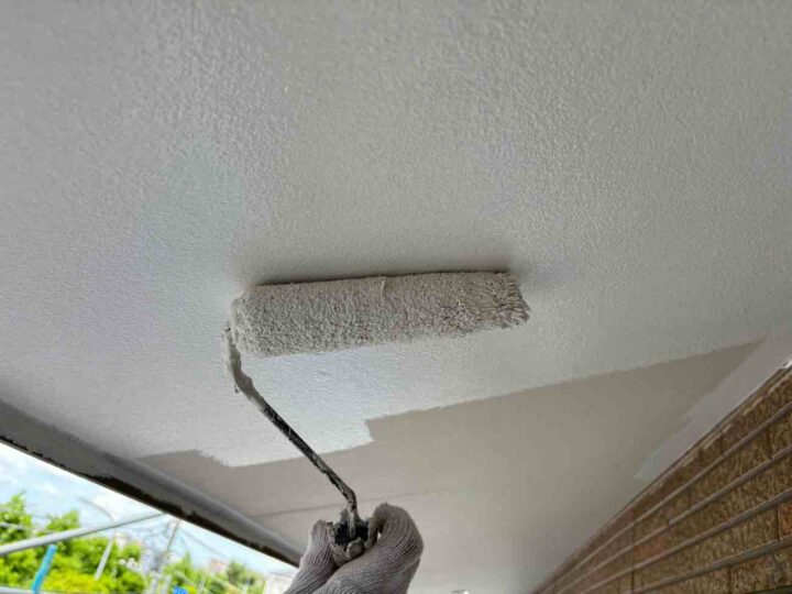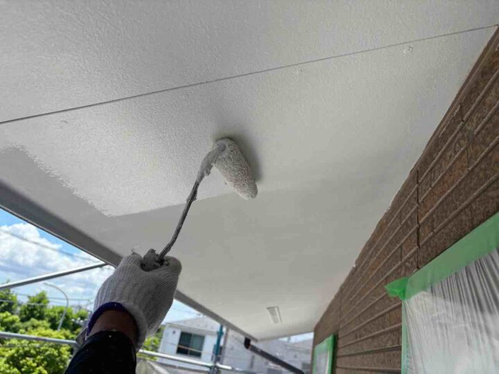 透湿性・防カビ性に優れた軒天井専用塗料にて、上塗り1回目を塗布しております。 -