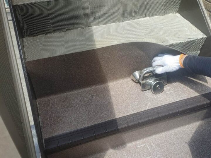 長尺シートの接着性をより強固にするために、ローラーにて圧着していきます。 -