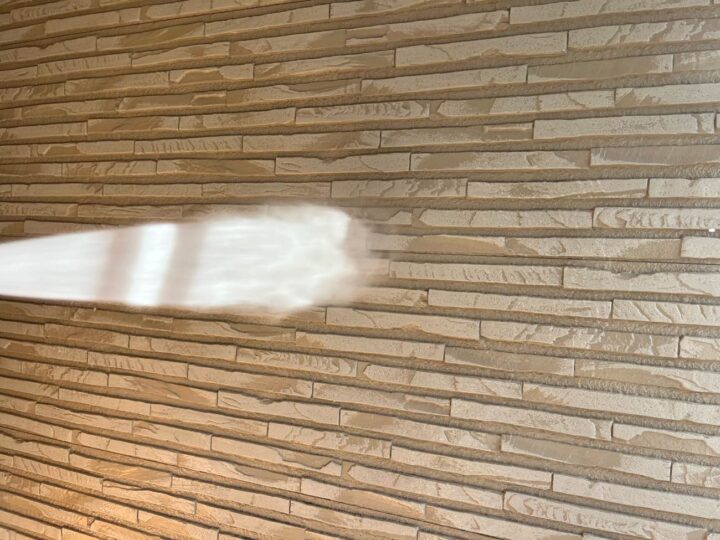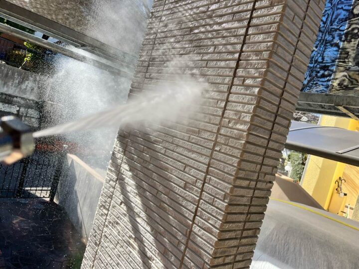 塗料の密着性を高める為、外壁に付いた長年の汚れやホコリなどを業務用の高圧洗浄機にて洗浄いたします。 -
