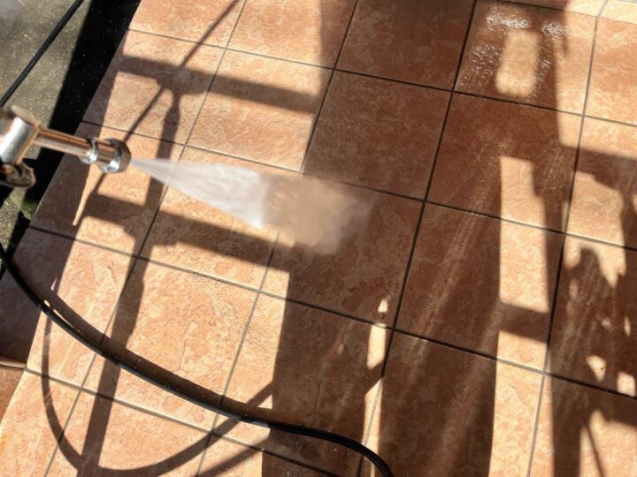 高圧洗浄の際、塗装する屋根や外壁だけではなく、駐車場床の土間なども高圧洗浄いたします。 -