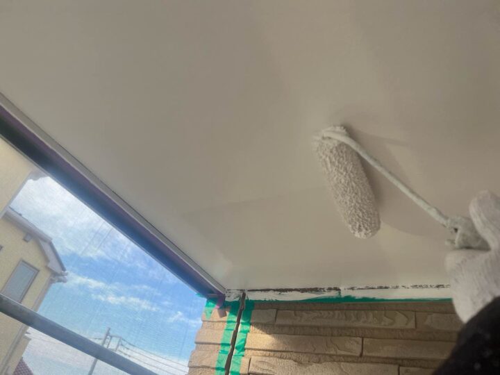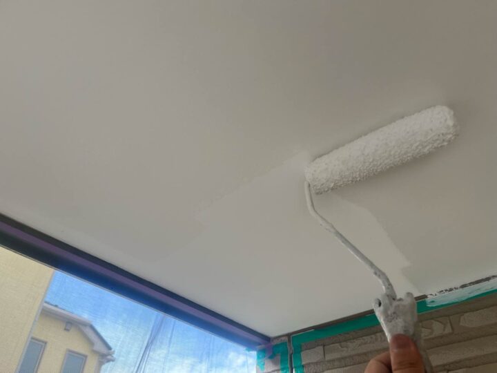 透湿性・防カビ性に優れた軒天井専用塗料にて、上塗り1回目を塗布しております。 -