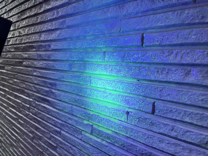 この「KFスーパーウレアコート」は蛍光顔料が添加されているので、ブラックライトを当てると塗り漏れの箇所は紫色になります。