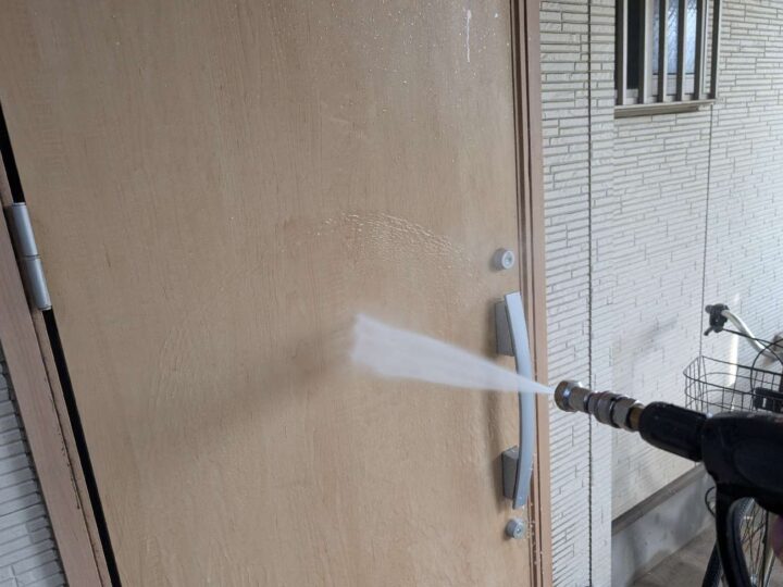 塗料の密着性を高める為、外壁に付いた長年の汚れやホコリなどを業務用の高圧洗浄機にて洗浄いたします。 -