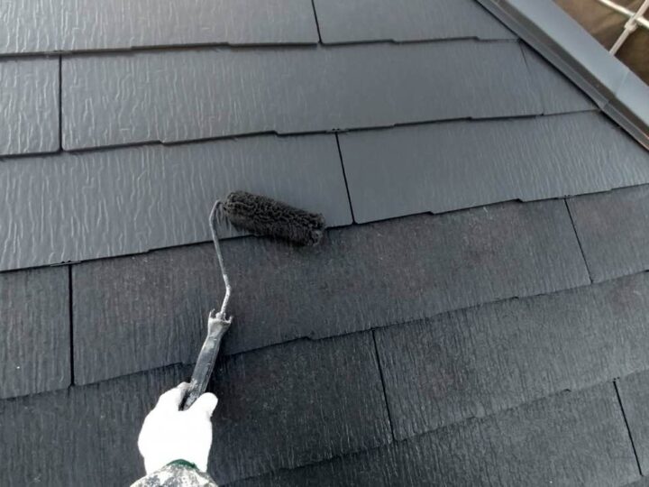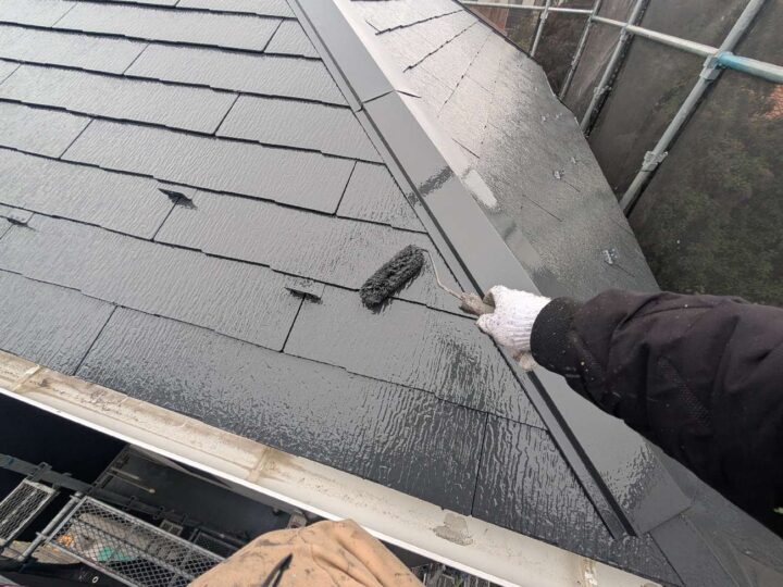屋根の上塗り2回目の行っております。 上塗り塗料を2回塗ることにより、塗料の耐久性を発揮します。 -
