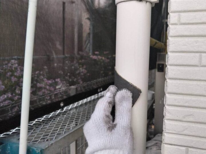 スチール製の付帯部は、塗料の密着性を高める為、ケレンという軽くキズを付ける作業が重要です。 -