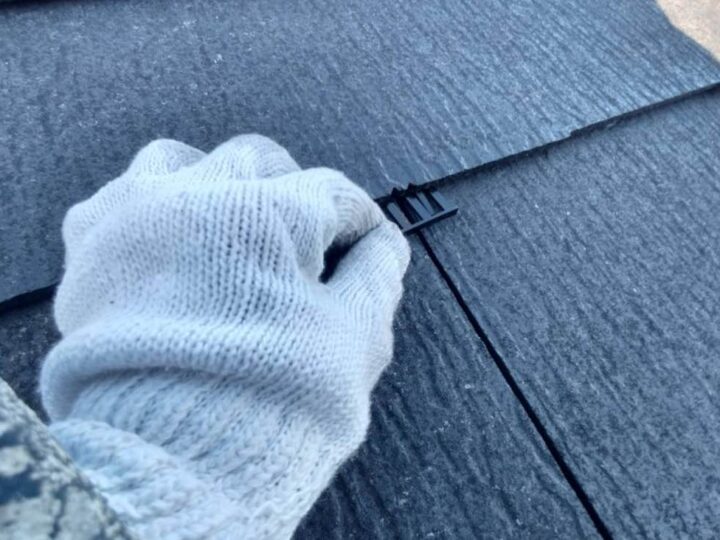 屋根材と屋根材の隙間を確保するため、「タスペーサー」という専用の部材を差し込みます。 屋根材の隙間を埋めてしまうと、狭いところに吸い上げられる「毛細管現象」という水の特性で、屋根の裏側に雨水が回り込み、雨漏りの原因となってしまいます。 -