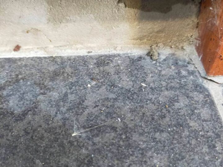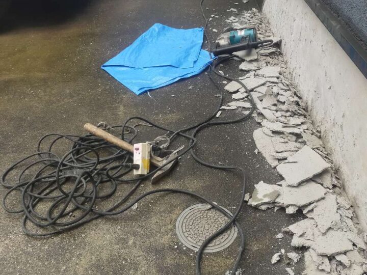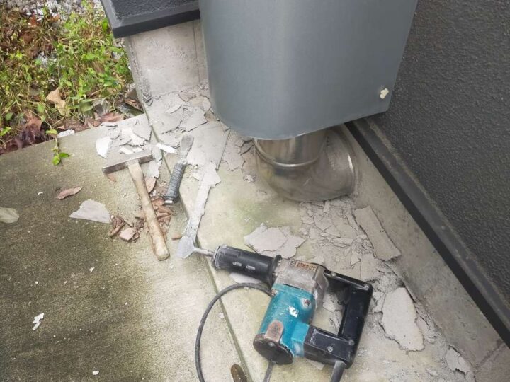 既存の基礎化粧モルタルを斫り、撤去していきます。 -
