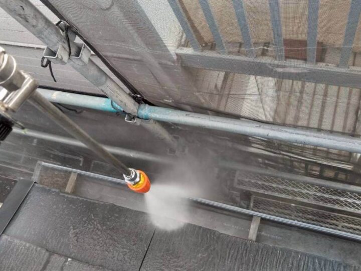 業務用の高圧洗浄機を使い、屋根を洗浄していきます。 外壁や屋根に付いた汚れなどを水圧で洗い流し、塗料の密着性を良くします。 -