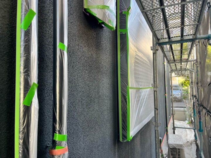 窓やアルミサッシなど、塗装しない箇所に塗料が付着しないよう、養生していきます。 -