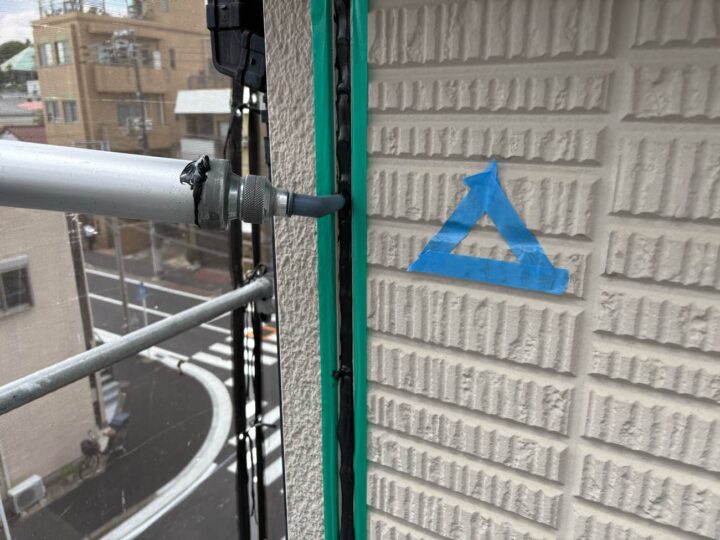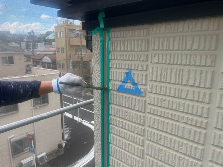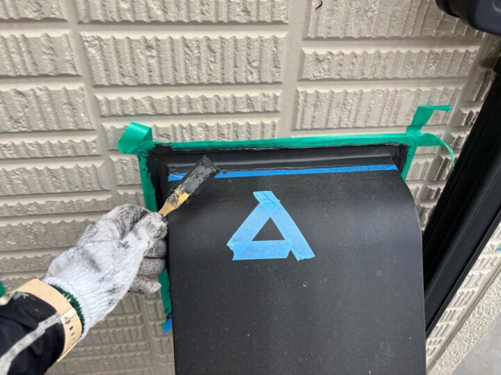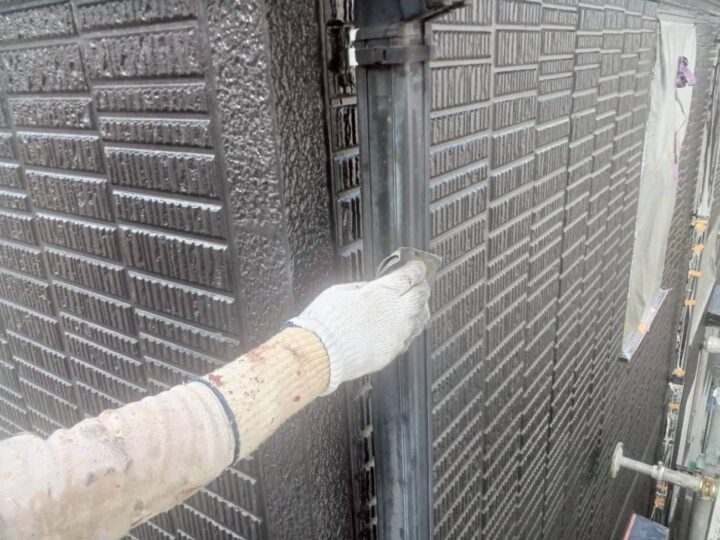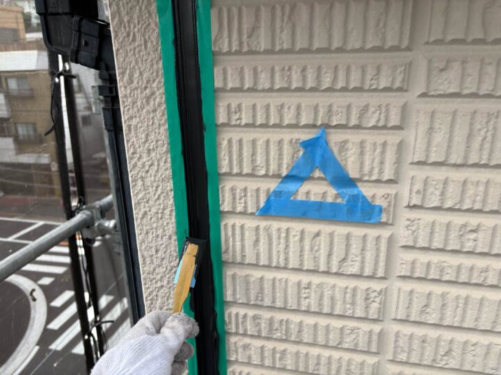 シーリング材打設の前に専用プライマーを塗布し、外壁材とシーリング材の付着性をよくします。 又、3面接着を回避するため2面にのみ塗布しています。 -
