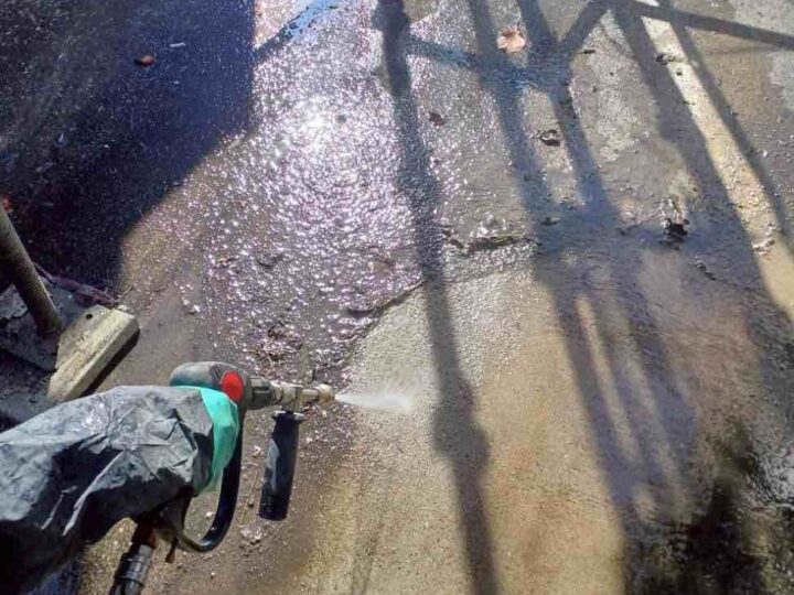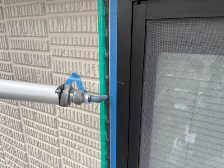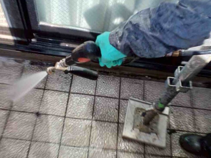 塗料の密着性を高める為、外壁に付いた長年の汚れやホコリなどを業務用の高圧洗浄機にて洗浄いたします。 -