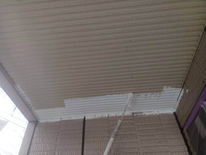 透湿性・防カビ性に優れた軒天井専用塗料にて、上塗り2回目を塗布しております。 -